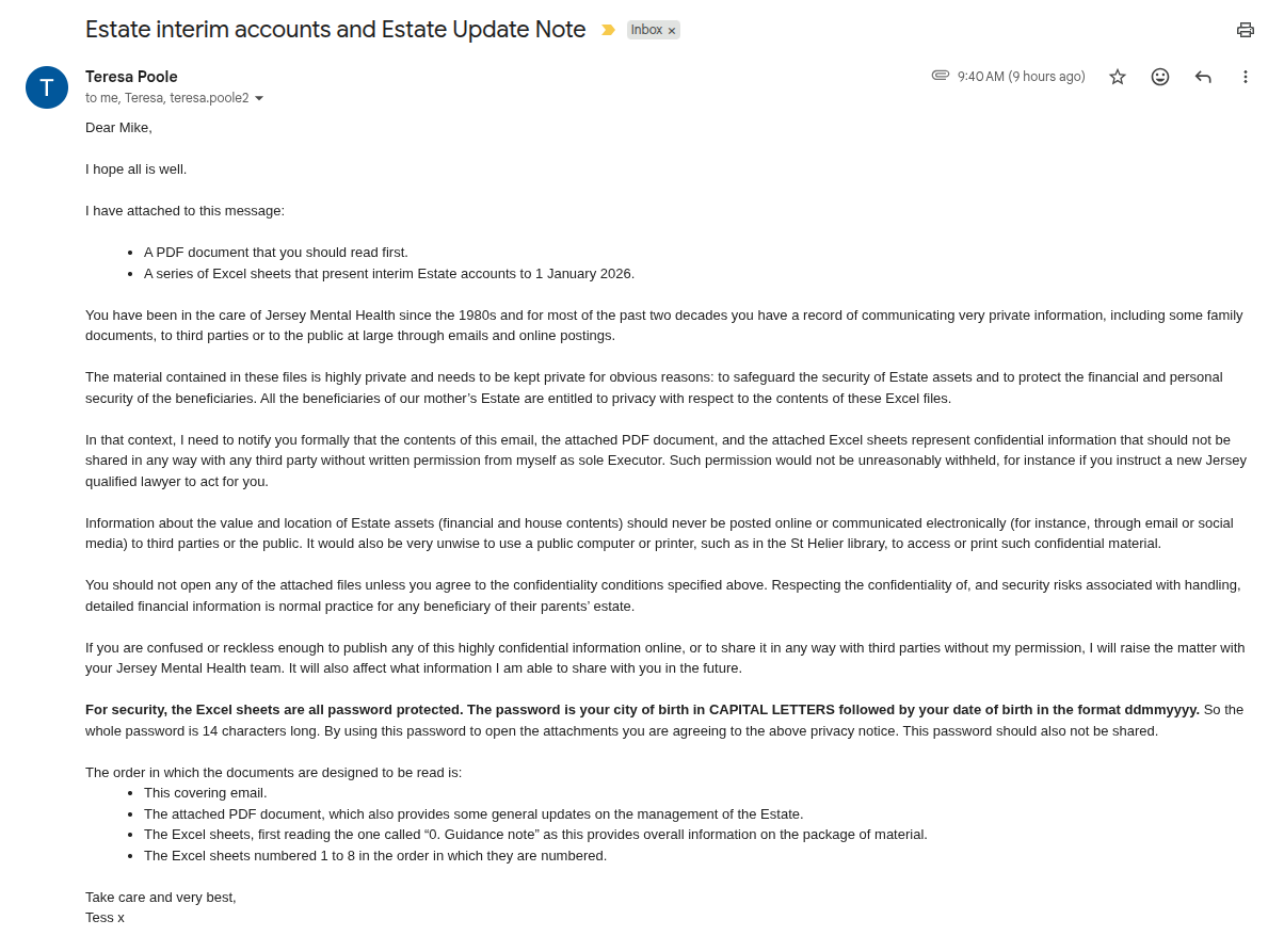 Viberts complied with my legal demand. Laundry is much harder for them now with the interim accounts. There were no interim or final accounts even over 3 years after the death either till the interims were provided.