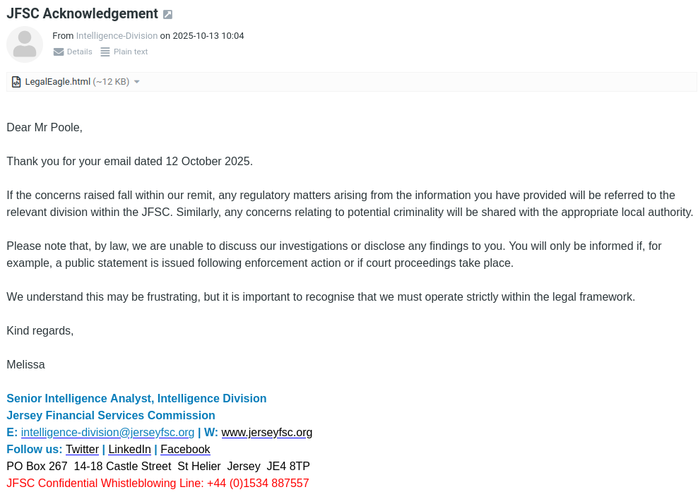 A decade or two later this inquiry into the Bailiff has led nowhere leading me at least to adjudicate that the regulator has still not got the capacity to